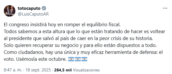 En paralelo, el ministro de Economía Luis Caputo aseguró que el Congreso insiste en romper el equilibrio fiscal y denunció directamente un intento de golpe institucional. “Todos sabemos a esta altura que lo que están tratando de hacer es voltear al Presidente que salvó al país de caer en la peor crisis de su historia. Solo quieren recuperar su negocio y para ello están dispuestos a todo”.