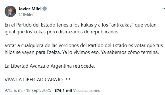 En su primera intervención pública tras el revés legislativo, Javier Milei apuntó a los legisladores del PRO y la UCR que apoyaron el rechazo a los vetos. “En el Partido del Estado tenés a los kukas y a los ‘antikukas’ que votan igual que los kukas pero disfrazados de republicanos. Votar a cualquiera de las versiones del Partido del Estado es votar que tus hijos se vayan para Ezeiza. Ya vivimos eso. Ya sabemos cómo termina. La Libertad Avanza o la Argentina retrocede. ¡Viva la libertad carajo!”, escribió en redes.