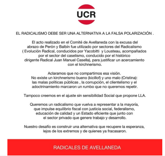 “El acto fue utilizado por sectores de la UCR, puntualmente Evolución, conducido por Lousteau y Yacobitti y el casselismo, para justificar un acercamiento con el kirchnerismo”, apuntaron. Y explicaron que ese sector busca tender puentes para ir en una alianza conjunta en las próximas elecciones, algo que ellos rechazan de plano.
